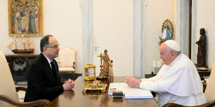 Presidenti i Republikës, Sh.T. Z. Bajram Begaj, vizitoi sot Selinë e Shenjtë në Vatikan, ku së bashku me Zonjën e Parë, Armanda Begaj, u prit në një audiencë të veçantë nga Ati i Shenjtë, Papa Françesku.