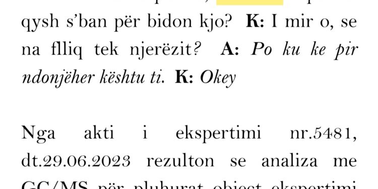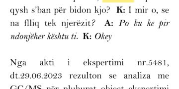 Nga akti i ekspertimi nr.5467, dt.29.06.2023 rezulton se analiza me GC/MS për pluhurat object ekspertimi tregoi për prani të kokainës. Pesha pa ambalazh është 0.417 gr.