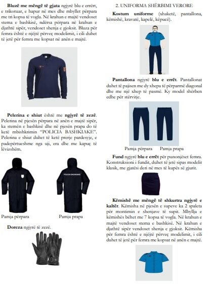 Deri më tani në munges të një uniforme standarte çdo bashki ka bërë uniforma të ndryshme. WebLajm zbardh vendimin e qeverisë që ka vendosur standart se si do jenë uniformat dimërore, verore, këpucët, kapelja, dorezat si dhe veshjet për burra e gra që shërbejnë në Policin Bashkiake.