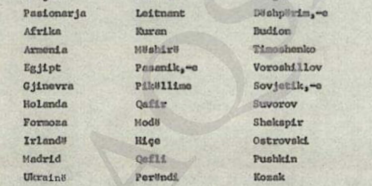 “Tito”, “Zhakov”, “Zhaklinë”, “Ukrainë”, “Rusi”, “Serbi”, “Kësmet”, “Kuran”, “Xhenet”, “Timoshenko”, “Gorki” etj, ishin disa prej emrave që bënin pjesë në “listën e zezë” (lexo dokumentin). Domosdoshmëria për ndryshimin e tyre, arsyetohej me qëllimin e “ruajtjes dhe të forcimit të traditave kulturore përparimtare”. Në vënien e emrave të rinj, duhej patur parasysh përmbushja e kriterit të një përmbajtjeje të shëndoshë “politike, ideologjike e përparimtare”.