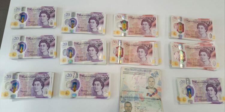 Gjatë kontrollit fizik në çanten e dorës, shtetasit Y.V , iu konstatuan vlera monetare. Pas numërimit në prani të këtij shtetasi, rezultoi se kishte shumën prej 11.000 (njëmbëdhjetë mijë) Paund britanik, të cilat iu sekuestruan në cilesinë e provës materiale.