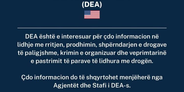 Për herë të dytë në pak muaj zyra e Agjencisë Kundrër Drogës DEA e cila funksionon tashmë edhe në Tiranë, pranë Spak dhe Policisë së Shtetit i bën apel shqiptarëve të ndajnë informacionet për emrat e trafikantëve dhe atyre që pastrojnë para.