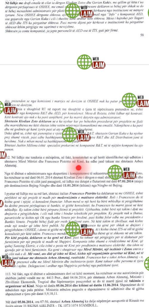 112. Në lidhje me tenderin e mësipërm, në fakt, konstatohet se që herët identifikohet një udhëtim i htetasve Mirel Mërtiri dhe Francesco Pistritto në Kinë, ku edhe janë takuar me shtetasin Arben Ahmetaj. Nga të dhěnat e administruara nga ekspertimi i kompjuterave të sekuestruara shtetasit Klodian Zoto, ka rezultuar se më datë 06.012014 shtetasi Klodian Zoto i dergon e-mail shtetasve Mirel Mërtirit dhe Francesco Pistritto tề cilët janë pasagjerë, në lidhje me detajet e fluturimit më datë 07.01.2014 (nisje) pēr destinacionin Bejing-Ningbo dhe datë 11.01.2014 (kthimi) nga Ningbo në Bejing, I pyetur në lidhje me sa më lart, shtetasi italian Francesco Pistritto ka deklaruar se me OSHEE, është pērfshirẽ nẽ një projekt tē madh per modernizimin e matěsave elektrikě. Roli Francescos do tẽ kishte qenė i njējtë, si konsulent financiar, Mban mend se njê herë ka berë mbledhje tě pěrgjithshme ku deshte present pērfaqēsues lë bankēs. tẽ gjithe konsultetët, ku Francesco ka marrë pjese në kete mbledhje. Ky takim eshtë bërẽ pērpara fitimit tẽ projektit, Gjithashtu, eshtè bērë një takim i dytë me drejtorin e pěrgjithshėm, i cili nuk ishte i bindur teknikisht pèr projektin. Ky projekt nuk u zbatua, pavarësisht se kishin një Ok nga banka Veneto pēr kredinë, pasi kishte folur edhe me presidentin e Bankės Veneto. Projekti behej fjale per rreth 9 milionë euro. Ne kẽtë takim te zhvilluar, nuk kishte ende një tender që ishte bërē publik. Nẻ, mbledhje, Francesco ka qěně per shkak se_drejtori pěrgjithshem i OSHEE, i donte tẽ gjithe nẽ mbledhje pēr diskutim. Ai i kishte thènë ITS-se sill të gjithě konsultetët pěr kētē takim. Francesco mendon se Klodian Zoto i ka thenë qẽ të shkonte ně atë takim Për këtë projekt, deklaron se ka qenë ně Kinë, pasi ka takuar nje pērgjegjës per lë diskutuar pěr furnizimin pēr një projekt të madh ně Shqipēri. Kompania ishte shumè e rěndēsishme ně Kině, qě quhej Sanxing Eletric, e cila është e pesta në Kinē per prodhimin e matēsave elektrikē. Ata ishin ne gjendje pēr tě berë furnizimin. Ka qenë i shoqěruar nga Mirel Měrtiri, një inxhinir i Zotos emrin e sẽ cilit nuk e di, Mě vonē, ato ditẽ qě ishte nẽ Kinë, kishte një organizimin qeveritar ně Kině, ne tê cilin janë takuar me shtetasin Arben Ahmetaj, rastësisht. Francesco kur e takoi Arben Ahmetaj – n, ishte nẽ prezencë edhe me Mirel Mērtirin dhe inxhinierin tjetër Kanē takuar edhe persona të tjerë por nuk i njihte. Delegacioni i ardhur nga Shqipëria pěrbehej nga politikaně tjere.