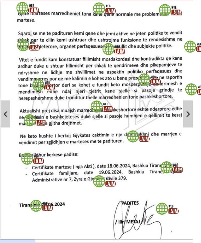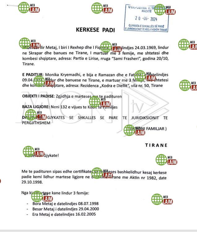 Kjo padi me dy faqe është protokolluar në sekretarinë gjykatës civile tiranë në seksionin e çështjeve familjare. Ndërsa çifti presidencial i shtohet atij të monarkëve të ndarë pak javë më parë ku Princ Leka i dha fund martesës me Elia Zaharinë.