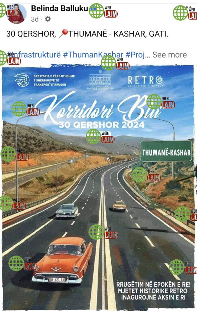 Pas pak live në Facebook:Hapet për qarkullim aksi i ri rrugor Thumanë-Kashar, autostradë e Kategorisë A të Bashkimit Europian, segmenti i parë i Korridorit Blu, që i paraprin tre kantiereve të reja Thumanë – Milot, Kashar – Lekaj dhe Lekaj – FierTë pranishëm do të jenë Kryeministri Edi Rama, Zëvendëskryeministrja, njëherësh Ministër i Infrastrukturës dhe Energjisë, Belinda Balluku dhe Ministrja për Turizmin dhe Mjedisin, Mirela Kumbaro.