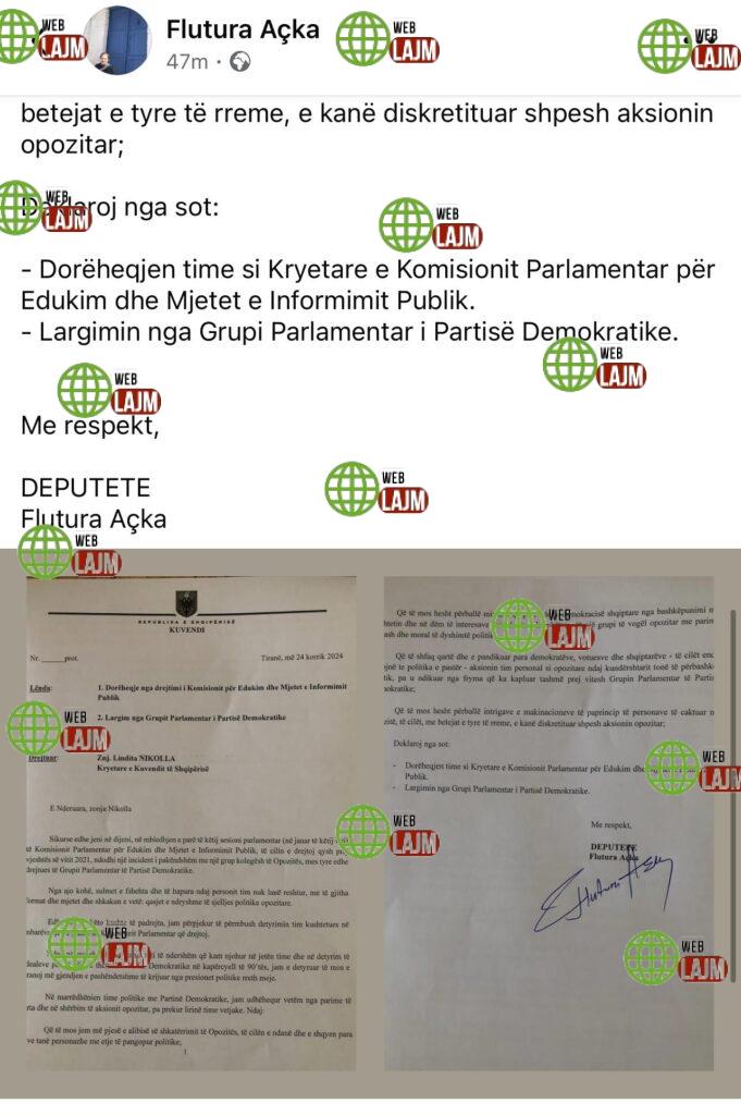 Deputetja Flutura Açka ka njoftuar largimin e saj nga Drejtimi i Komisionit Parlamentar për Edukim dhe Mjetet e Informimit Publik dhe largim nga Grupi Parlamentar i Partisë Demokratike.