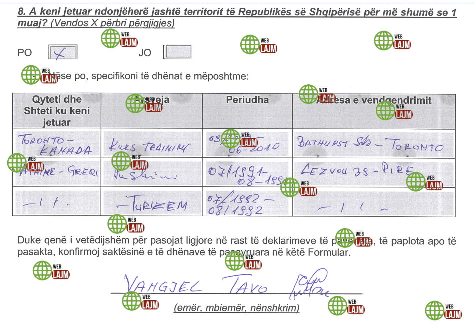 Siç dhe shihet në këtë faksimile të vetdeklarimit ai shpjegon se ka qëndruar jashtë vëndit për më shumë se 30 në tre periudha përfshi vendi si Kanada dhe Greqi, ndërsa tek katrori i tretë është bosh vendqëndrimi, ndërsa vendbanimi aktual i Tavos është lagja Palasë.