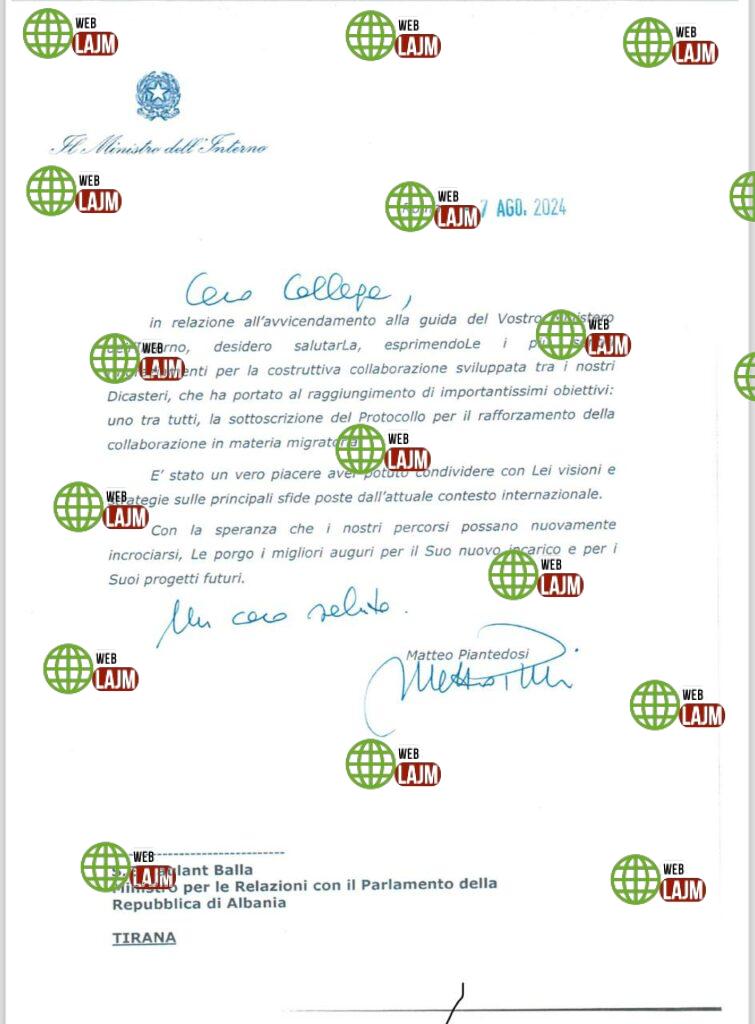 Duke vlersuar bashkëpunimin mes dy kolegësh Matteo Piandetosi Ministri Italian i Brendshën ka shprehur vlersim dhe falenderim ndaj ish homologut të tij Taulant Balla. Me anë të një letre ai vlerson marrëdhëniet dy palëshe dhe objektivat e arritura.