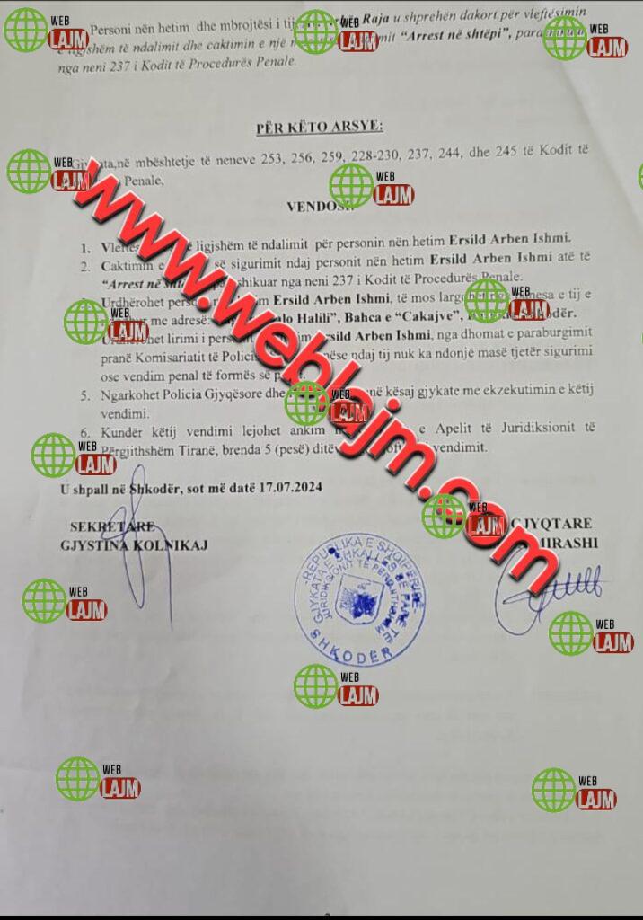 3. Urdherohet personi nën hetim Ersild Arben Ishmi, tẽ mos largohet nga banesa e tij e ndodhur me adresẽ: Lagjen “Salo Halili”, Bahca e “Cakajve”, Bashkia Shkodër.