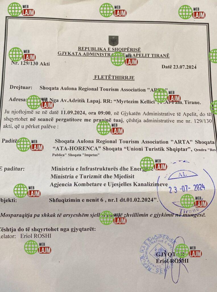 Më 11 shtator do të shqyrtohet në seancë në Gjykatën e Apelit Administrativ padia për shfuqizimin e udhëzimit që detyron subjektet e hotelerisë për instalimin e impianteve për trajtimin e ujërave të ndotura.