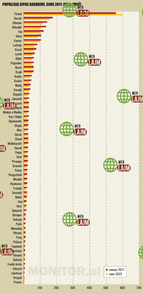 Në disa qytete, pesha e popullsisë ndaj totalit ka pësuar rënie të ndjeshme ndërmjet dy censeve. P.sh. në Shkodër në vitin 2023 jetonte 4.3% e popullsisë nga 4.8% në vitin 2011. Secila nga 30 bashkitë e vendit ka peshë më pak se 1% të popullsisë totale.