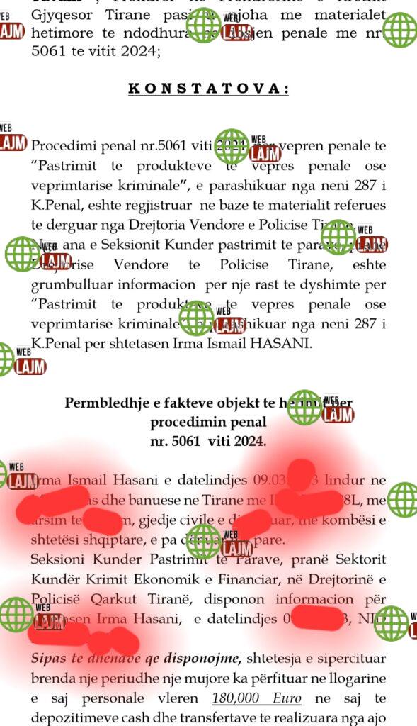 Weblajm ka siguruar dokumentin ku zbulohet një rast pastrimi parash të fituara nga prodhimi dhe shitja e narkotikëve, të cilat kanë ardhur me pas në Shqipëri, duke u bërë kështu subjekt hetimi për shkak të rrethanave se si kaluan në llogarinë bankare të shtetases Irma Hasani me profesion banakjere në shtet.