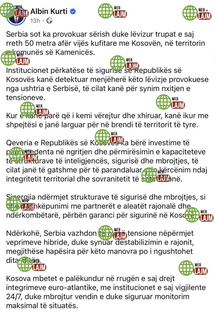 Kryeministri i Kosovës, Albin Kurti, ka thënë të shtunën mbrëma se Serbia ka provokuar sërish, “duke lëvizur trupat e saj rreth 50 metra afër vijës kufitare me Kosovën”, më saktësisht afër Komunës së Kamenicës.
