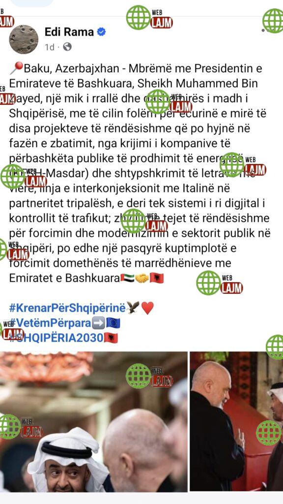Presidentin e Emirateve të Bashkuara, Sheikh Muhammed Bin Zayed gjatë samitit për klimin në Azerbajxhan ka shtruar një darkë informale ku të ftuar ka patur Kryeministrin Edi Rama dhe Presidentin Bjellorus Aleksandër Lukashenko.
