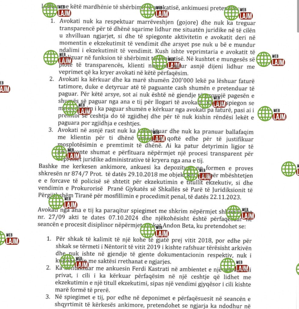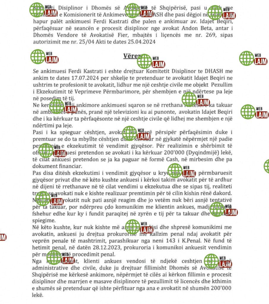 Ankimuesi Ferdi Kastrati i është drejtuar Komitetit Disiplinor te DHASH me ankim te dates 17.07.2024 për shkelje te pretenduar te avokatit Idajet Beqiri ne ushtrim te profesionit te avokatit, lidhur me një çështje civile me objekt Pezullim i Ekzekutimit të Veprimeve Përmbarimore, për shembjen e një ndërtese pa leje në posedim të tij.
