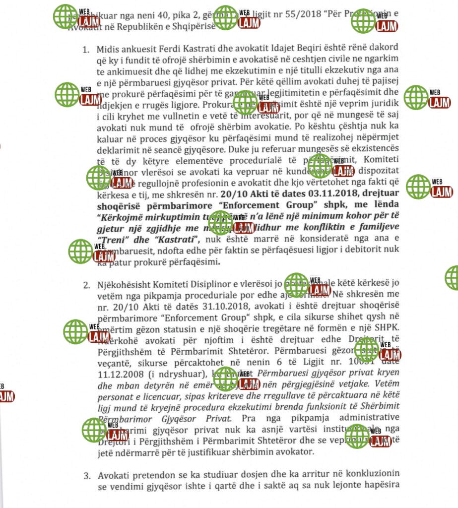 1. Midis ankuesit Ferdi Kastrati dhe avokatit Idajet Beqiri është rënë dakord që ky i fundit të ofrojë shërbimin e avokatisë në çështjen civile ne ngarkim te ankimuesit dhe që lidhej me ekzekutimin e një titulli ekzekutiv nga ana e një përmbaruesi gjyqësor privat. Për këtë qëllim avokati duhej të pajisej me prokurë përfaqësimi për të garantuar legjitimitetin e përfaqësimit dhe ndjekjen e rrugës ligjore. Prokura e përfaqësimit është një veprim juridik i cili kryhet me vullnetin e vetë të interesuarit, por që në mungesë të saj avokati nuk mund të ofrojë shërbim avokatie. Po kështu çështja nuk ka kaluar në proces gjyqësor ku përfaqësimi mund të realizohej nëpërmjet deklarimit në seancë gjyqësore. Duke ju referuar mungesës së ekzistencës të të dy këtyre elementëve procedurale të përfaqësimit, Komiteti Disiplinor vlerësoi se avokati ka vepruar në kundërshtim me dispozitat ligjore që rregullojnë profesionin e avokatit dhe kjo vërtetohet nga fakti që kërkesa e tij, me shkresën nr. 20/10 Akti të dates 03.11.2018, drejtuar shoqërisë përmbarimore “Enforcement Group” shpk, me lënda “Kërkojmë mirëkuptimin tuaj për të n’a lënë një minimum kohor për të gjetur një zgjidhje me mirëkuptim lidhur me konfliktin e familjeve “Treni” dhe “Kastrati”, nuk është marrë në konsideratë nga ana e përmbaruesit, ndofta edhe për faktin se përfaqësuesi ligjor i debitorit nuk ka patur prokurë përfaqësimi.