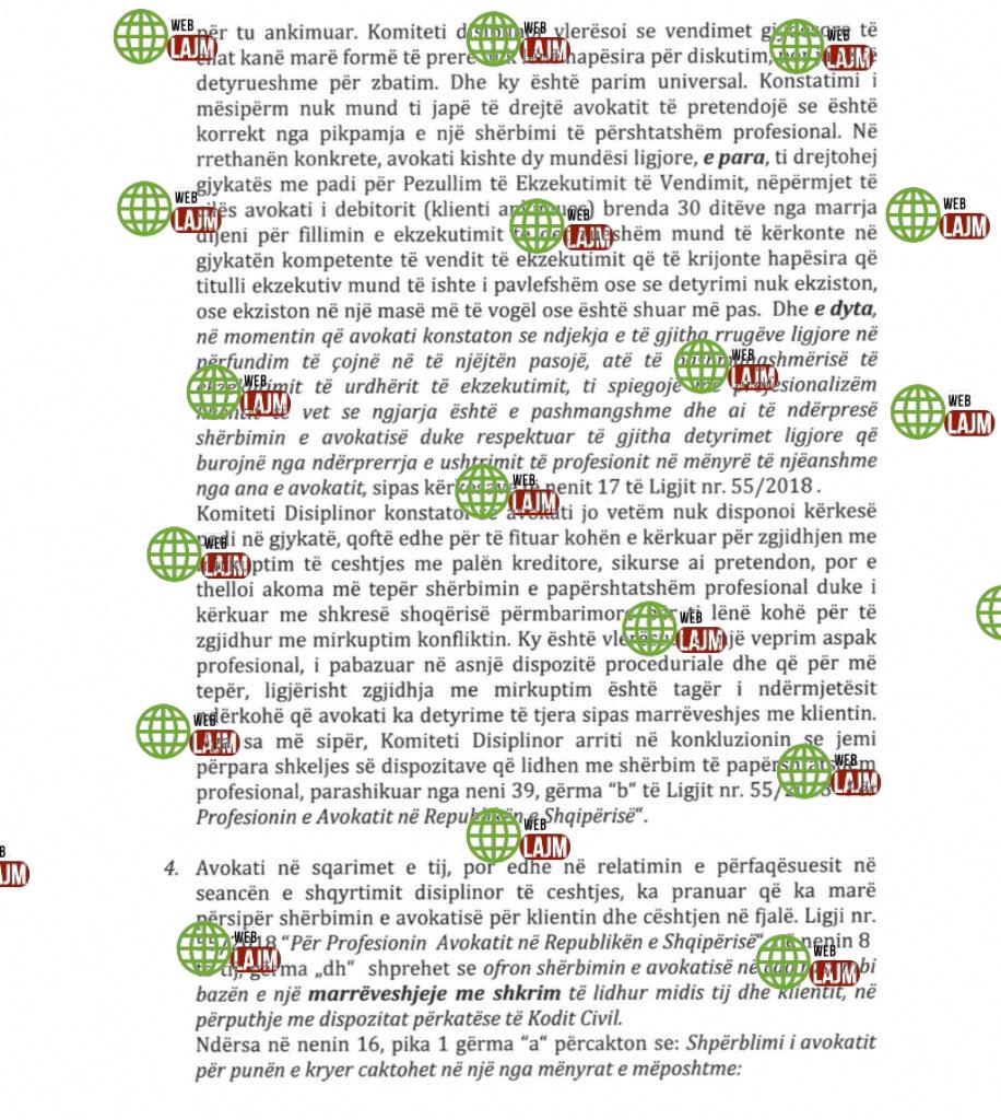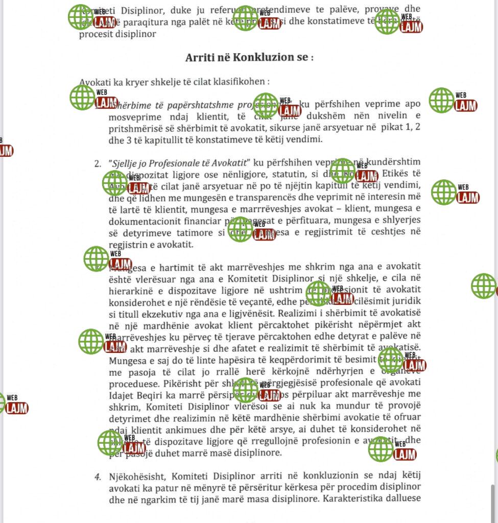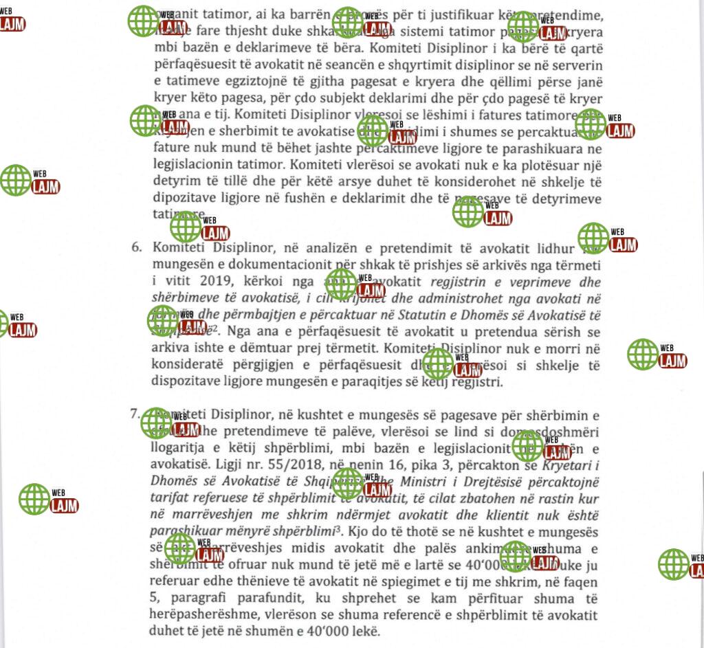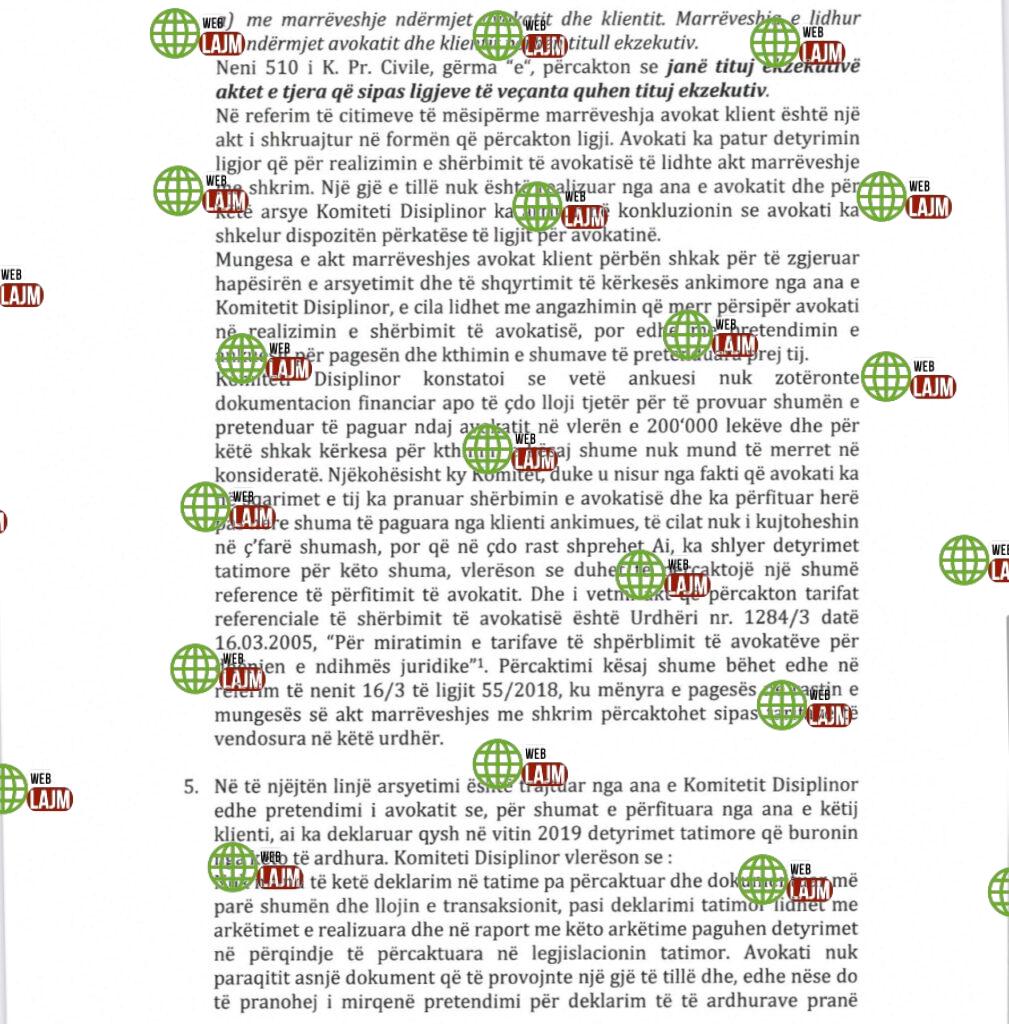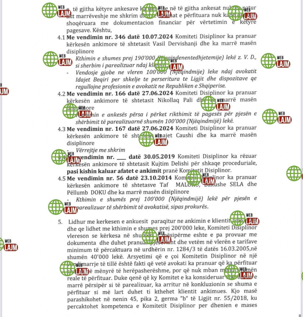 4. Njëkohësisht, Komiteti Disiplinor arriti në konkluzionin se ndaj këtij avokati ka pasur në mënyrë të përsëritur kërkesa për procedim disiplinor dhe në ngarkim të tij janë marrë masa disiplinore. Karakteristika dalluese e të gjitha këtyre ankesave ka qenë se në të gjitha ankesat nuk ka pasur akt marrëveshje me shkrim dhe se shumat e përfituara nuk kanë qenë të shoqëruara me dokumentacion financiar për vërtetimin e këtyre pagesave. Kështu,