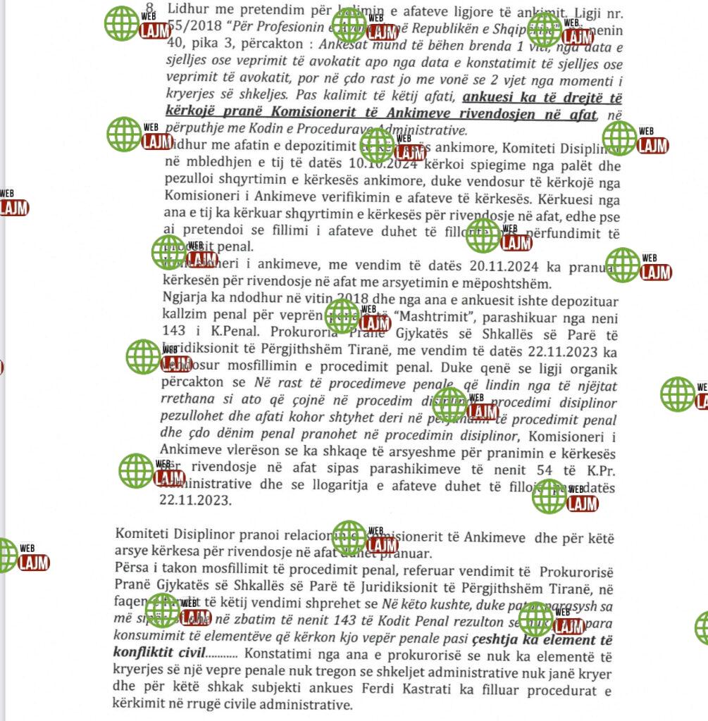 8. Lidhur me pretendim për kalimin e afateve ligjore të ankimit. Ligji nr. 55/2018 “Për Profesionin e Avokatit në Republikën e Shqipërisë”, në nenin 40, pika 3, përcakton: Ankesat mund të bëhen brenda 1 viti, nga data e sjelljes ose veprimit të avokatit apo nga data e konstatimit të sjelljes ose veprimit të avokatit, por në çdo rast jo me vonë se 2 vjet nga momenti i kryerjes së shkeljes. Pas kalimit të këtij afati, ankuesi ka të drejtë të kërkojë pranë Komisionerit të Ankimeve rivendosjen në afat në përputhje me Kodin e Procedurave Administrative.