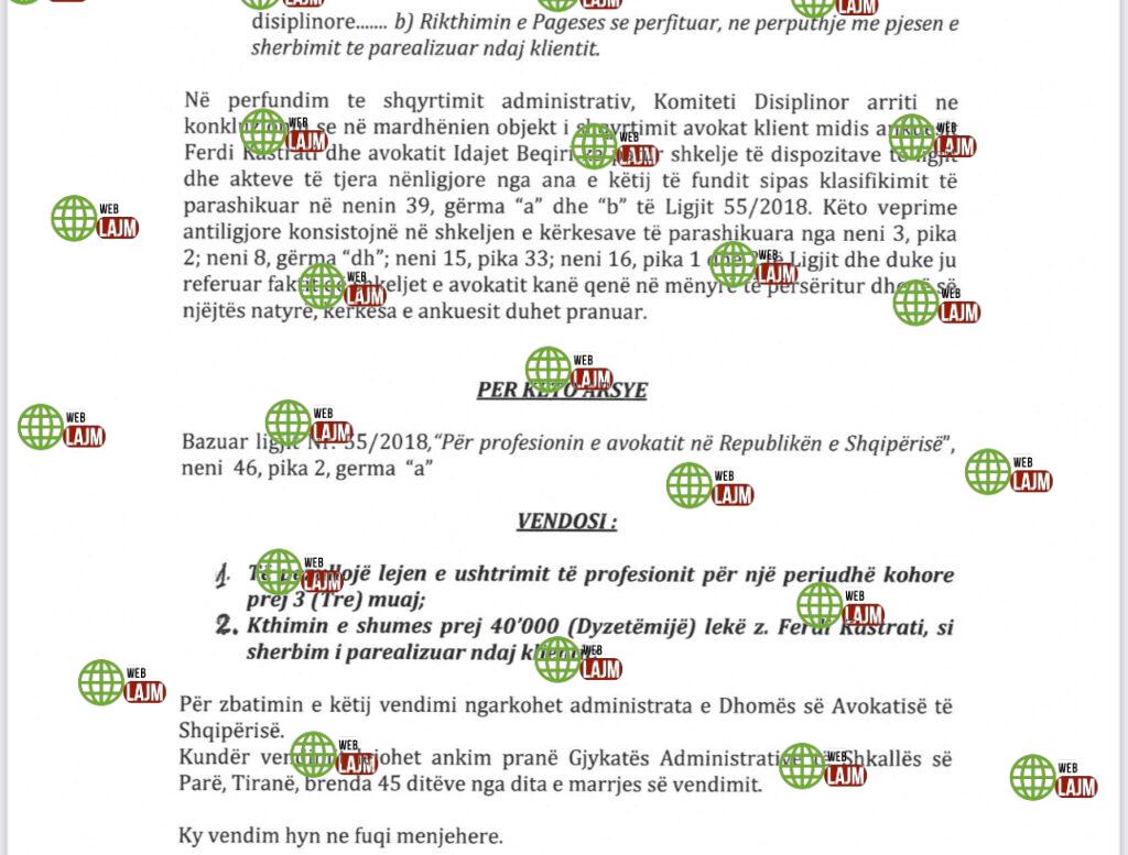 Lidhur me rastin, gjithashtu ndaj Idajet Beqirit u vendos kthimi i shumës prej 40’000 lekë ndaj Ferdi Kastratit, si shërbim i parealizuar ndaj klientit.