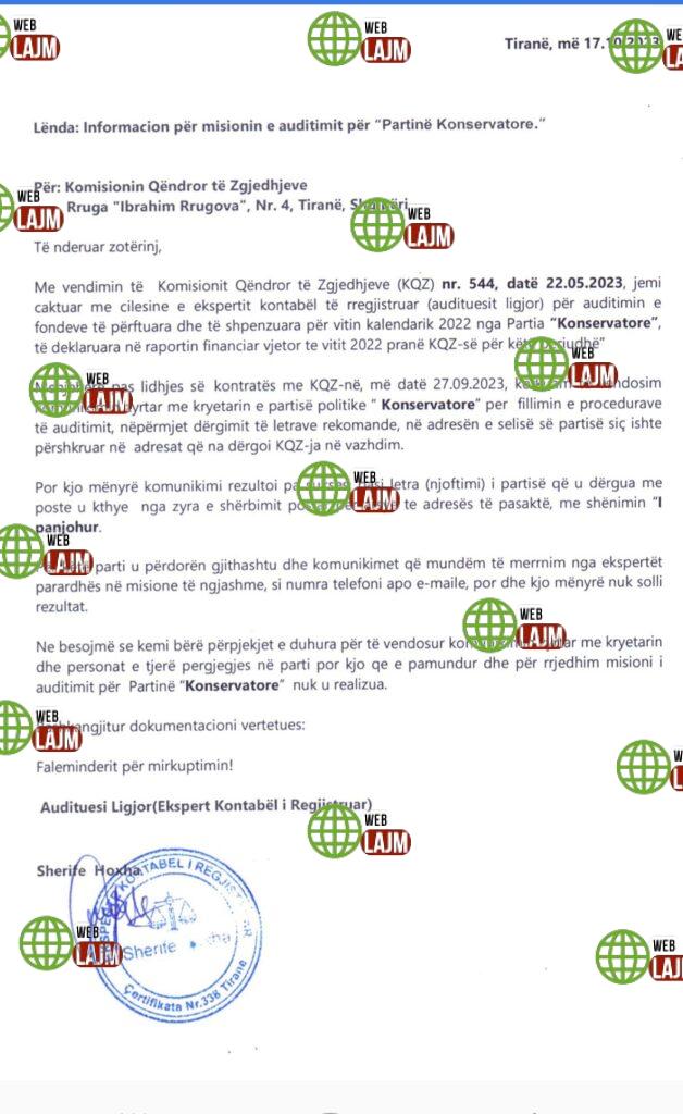 Me vendimin të Komisionit Qëndror të Zgjedhjeve (KQZ) nr. 544, datë 22.05.2023, jemi caktuar me cilesine e ekspertit kontabël të rregjistruar (audituesit ligjor) për auditimin efondeve të përftuara dhe të shpenzuara për vitin kalendarik 2022 nga Partia “Konservatore”të deklaruara në raportin financiar vjetor te vitit 2022 pranë KQZ-së për kětë periudhë “Menjeherë pas lidhjes së kontratës me KQZ-në, më datë 27.09.2023, kërkuam të vendosim komunikimin zyrtar me kryetarin e partisë politike ” Konservatore” per filimin e proceduravetë auditimit, nëpërmjet dërgimit të letrave rekomande, në adresën e selisë së partisë siç ishte përshkruar në adresat që na dërgoi KQZ-ja në vazhdim. Por kjo mënyrë komunikimi rezultoi pa sukses, pasi letra (njoftimi) i partisë që u dërgua me poste u kthye nga zyra e shërbimit postar per arsye te adresës të pasaktë, me shënimin “I|panjohur. Për kētë parti u përdorën gjithashtu dhe komunikimet që mundëm të merrnim nga ekspertët parardhës në misione të ngjashme, si numra telefoni apo e-maile, por dhe kjo měnyrë nuk solli rezultat. Ne besojmë se kemi bërë përpjekjet e duhura për të vendosur komunikimin zyrtar me kryetarin dhe personat e tjerë pergjegjes në parti por kjo qe e pamundur dhe për rrjedhim misioni i auditimit për Partinë “Konservatore” nuk u realizua.