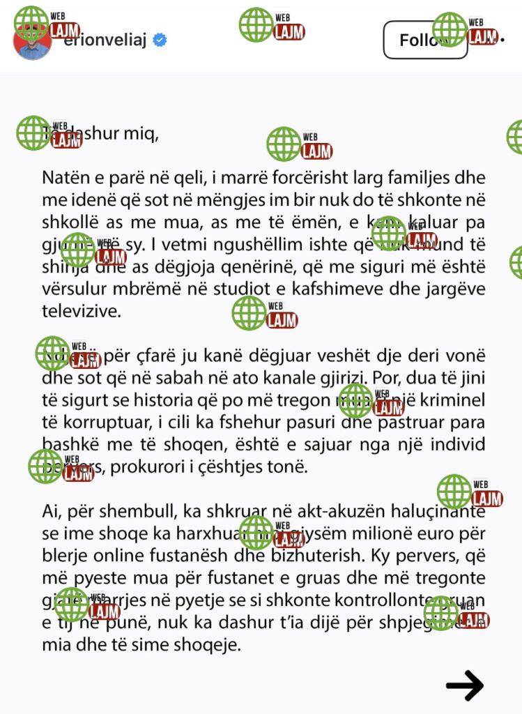 Ndjesë për çfarë ju kanë dëgjuar veshët dje deri vonë dhe sot që në sabah në ato kanale gjirizi. Por, dua të jini të sigurt se historia që po më tregon mua si një kriminel të korruptuar, i cili ka fshehur pasuri dhe pastruar para bashkë me të shoqen, është e sajuar nga një individ pervers, prokurori i çështjes tonë.