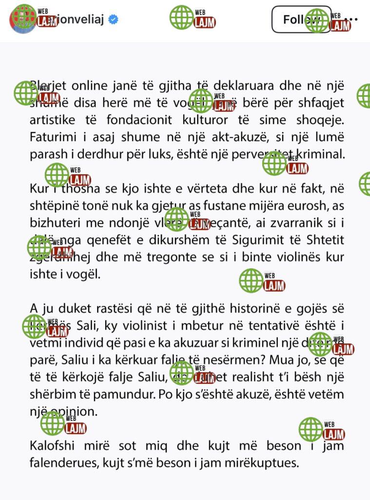 Ai, për shembull, ka shkruar në akt-akuzën haluçinante se ime shoqe ka harxhuar mbi gjysëm milionë euro për blerje online fustanësh dhe bizhuterish. Ky pervers, që më pyeste mua për fustanet e gruas dhe më tregonte gjatë marrjes në pyetje se si shkonte kontrollonte gruan e tij në punë, nuk ka dashur t’ia dijë për shpjegimet e mia dhe të sime shoqeje. Blerjet online janë të gjitha të deklaruara dhe në një shumë disa herë më të vogël, janë bërë për shfaqjet artistike të fondacionit kulturor të sime shoqeje. Faturimi i asaj shume në një akt-akuzë, si një lumë parash i derdhur për luks, është një perversitet kriminal.