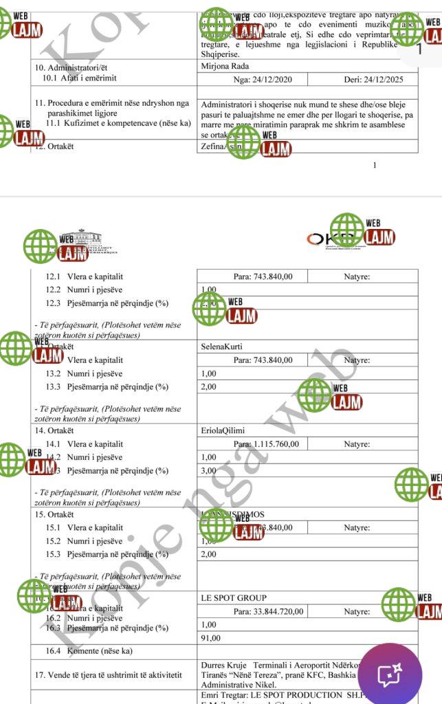 Një ndër aksionerët e Kompanisë që ka marrë 100 mijë euro rezulton sipas qkr gazetarja Zefina Asani sot drejtoresh e Le Spot dhe e njohur si personi që menaxhon reklamat për llogari të z.Çami.