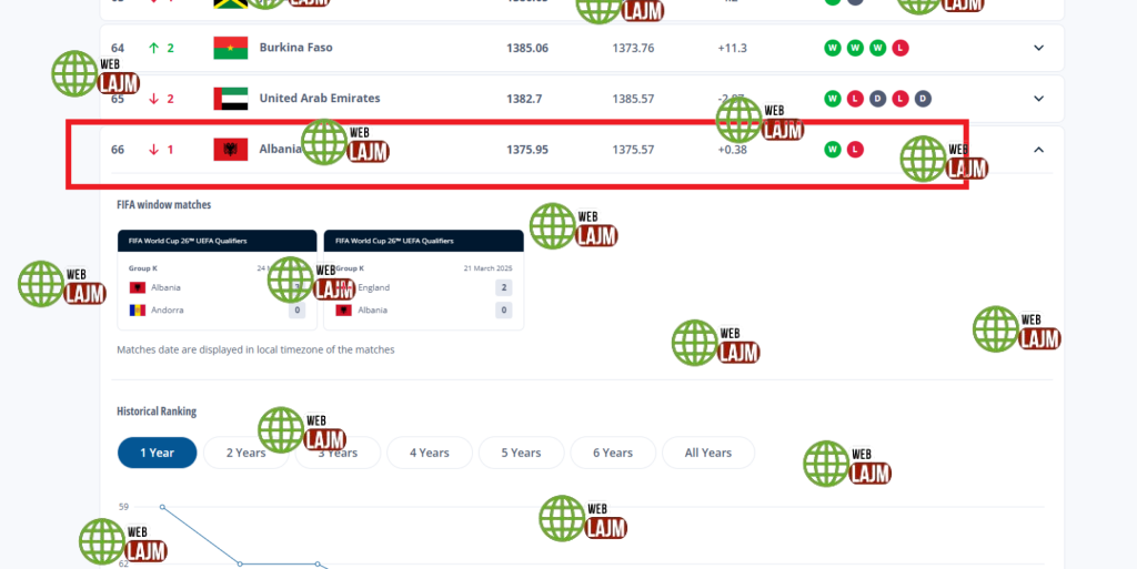 Sipas përditësimit më të fundit, Shqipëria ka humbur një pozicion dhe renditet në vendin e 66. Renditja në këtë pozicion është ndikuar nga humbja me Anglinë dhe fitorja me Andorrën.