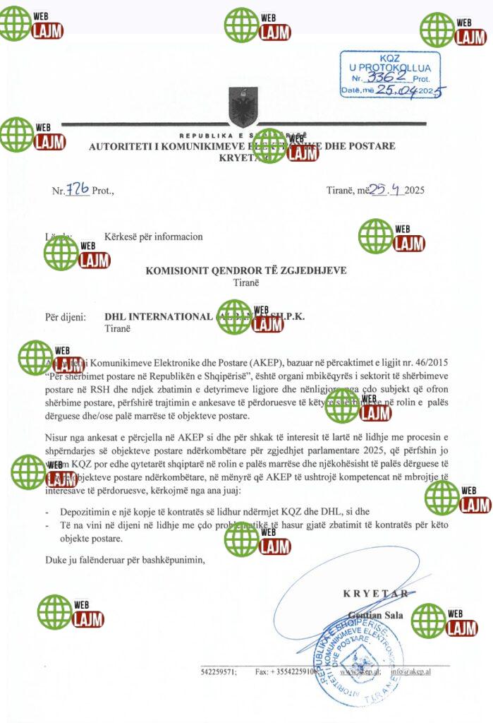 Autoriteti i Komunikimeve Elektronike dhe Postare (AKEP) i ka kërkuar zyrtarisht Komisionit Qendror të Zgjedhjeve (KQZ) të vërë në dispozicion kontratën e nënshkruar me kompaninë ndërkombëtare të shërbimeve postare, DHL.
