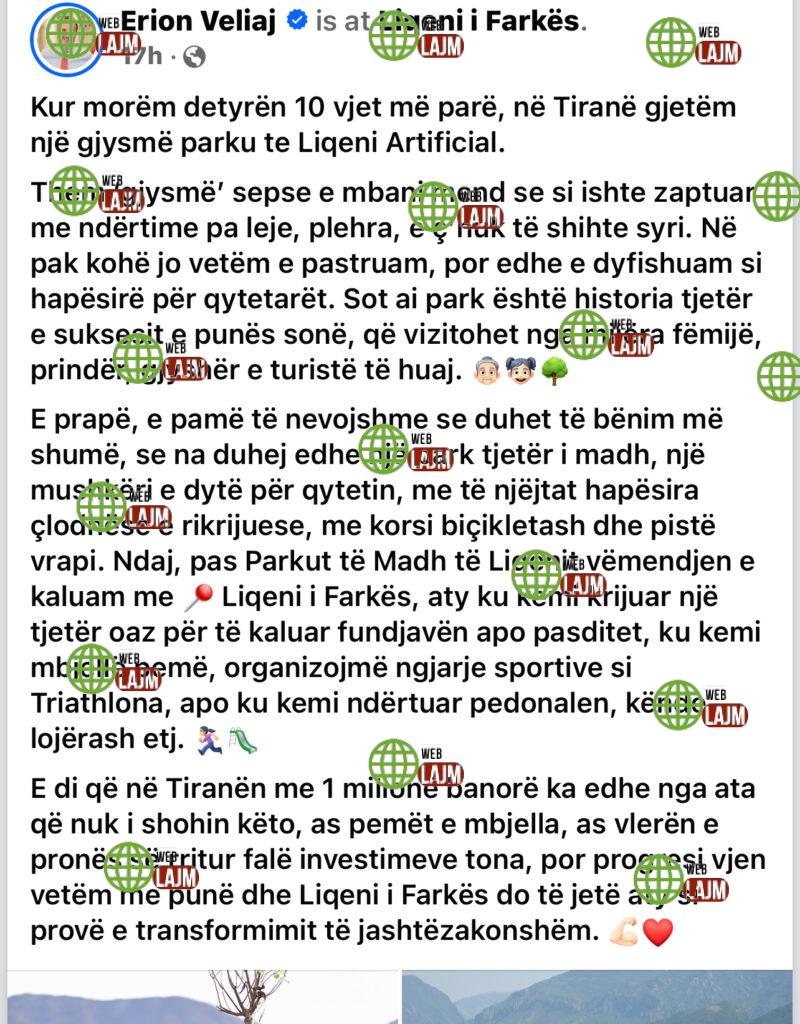 Përmes një mesazhi në rrjete sociale Veliaj thotë se parku i Liqenit të Farkës, nga një zonë e zaptuar dhe e mbushur me plehra është shndërruar në një hapësirë të rëndësishme për qytetarët.