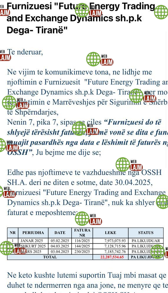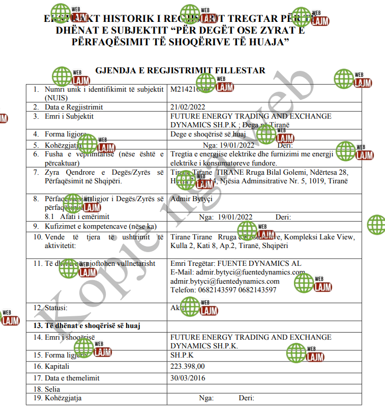 Në redaksinë e weblajm.com ka mbërritur një denoncim mbi kompaninë e huaj, me filial në Shqipëri, Future Energy Trading and Exchange Dynamics sh.p.k., e cila i detyrohet shtetit afro 220 mijë euro.