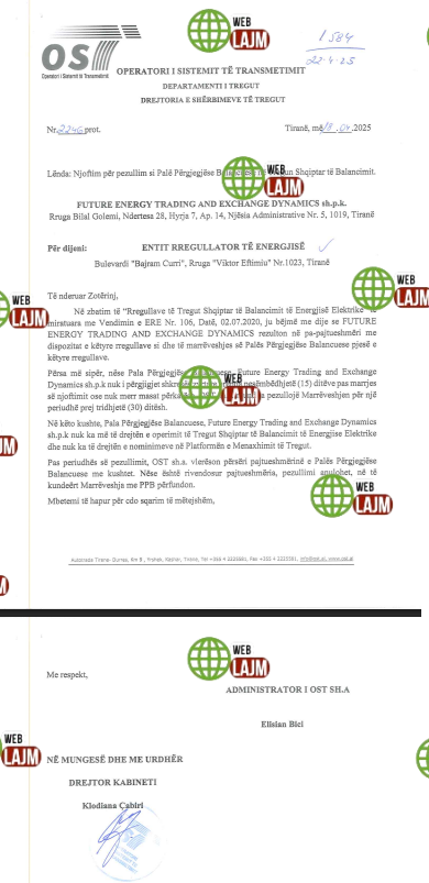 Operatori i Sistemit të Transmetimit të Energjisë Elektrike (OST) i është drejtuar kompanisë në administrim të biznesmenit Admir Bytyçi më datë 18 prill me shkresë: