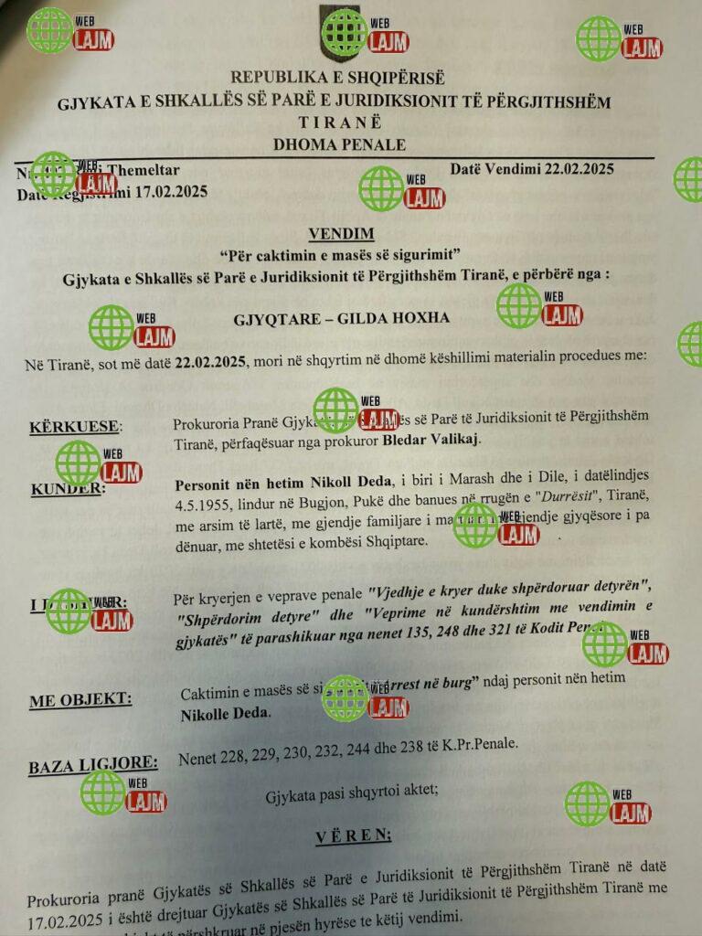 Me kërkesë të Prokurorisë Tiranë, caktohet masa e sigurisë ‘Arrest në burg’ për ish-Presidentin e Urdhrit të Stomatologut, N.D. për 3 vepra penaleMe kërkesën e Prokurorisë pranë Gjykatës së Shkallës së Parë të Juridiksionit të Përgjithshëm, Tiranë u ekzekutua masa “Arrest në burg” për shtetasin N.D. për kryerjen e veprave penale “Vjedhje e kryer duke shpërdoruar detyrën”, “Shpërdorim detyre” dhe “Veprime në kundërshtim me vendimin e gjykatës” të parashikuar nga nenet 135, 248 dhe 321 të Kodit Penal.Ky shtetas u denoncua nga shtetasi A.G. në Seksionin për Hetimin e Krimit Ekonomik e Financiar për shpërdorim të fondeve dhe se ka vepruar në kundërshtim me ligjin duke rritur buxhetin e ‘Urdhrit të Stomatologut’ nga viti në vit.Në vitin 2020 ku buxheti ishte 38.500.000 Lek, në vitin 2021 e ka shtuar në vitin me 13.500.000 Lek më shumë. Në vitin 2022 buxheti ka shkuar në vlerën 125.837.000 Lek për arsye se ka blerë dhe godinë për institucionin, duke përfshirë dhe investimin që ka bërë brenda godinës.Nga veprimet hetimore rezultoi se ka dyshime të arsyeshme se gjithë rritja e buxhetit ka qenë me qëllim shpërdorimin e fondeve dhe përfitimeve personale për vete apo persona të tretë.Prokuroria pranë Gjykatës së Shkallës së Parë të Juridiksionit të Përgjithshëm, Tiranë çmon se në ngarkim të të dyshuarit N.D. ekziston dyshimi i arsyeshëm i bazuar në prova se ka konsumuar elementët e figurës së veprave penale “Vjedhje e kryer duke shpërdoruar detyrën”, “Shpërdorim detyre” dhe “Veprime në kundërshtim me vendimin e gjykatës” të parashikuar nga nenet 135, 248 dhe 321 të Kodit Penal. Sipas raporti Informacioneve shtetasi N.D. është larguar dhe i është shmangur veprimeve hetimore të kryera nga policia gjyqsore duke e bërë evident e konkret rrezikun e ikjes dhe shgmangies nga pergjegjesia penale. Shtetasi në fjalë në cilësinë e Presidentit të Urdhrit të Stomatologëve lejoi punësimin e njerëzve pa kriter, familjarë të tij, me qëllim manipulimin e vendimmarrjeve të Këshillit Kombëtar nga viti 2016.Pavarësisht se është marrë i pandehur dhe është aktualisht në proces gjyqësor i akuzuar për nenin 320 të Kodit Penal në një tjetër procedim, ka ndërmarrë veprime aktive në shpërdorim të detyrës për përqendrim të mëtejshëm të kompetencave në duart e tij duke shfrytëzuar strukturat e USSH-së.Organi i Prokurorisë vlereson se është e nevojshme marrja e masës së sigurimit personal ndaj shtetasit Nikoll Deda, pasi ekzistojnë shkaqe të rëndësishme që vënë në rrezik marrjen ose vërtetësinë e provës dhe ekziston rreziku që ai të largohet.