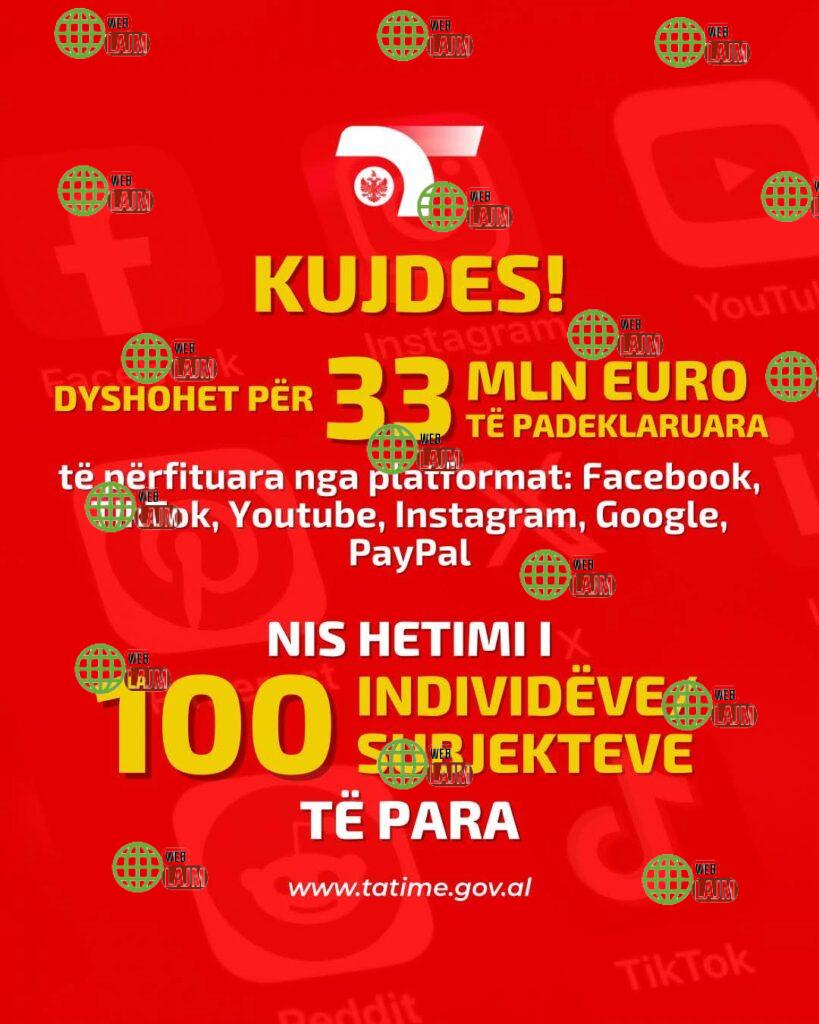 Hetimi Tatimor ka nisur hetimet ndaj 100 subjekteve dhe individëve për të ardhurat që ata kanë përfituar nga rrjetet sociale. Përmes një njoftimi zyrtar Tatimet bënë të ditur se nga verifikimet paraprake dyshohet që këto subjekte dhe individë kanë përfituar rreth 33 milionë euro të padeklaruara nga platformat sociale si Facebook; TikTok; YouTube; Instagram; Google dhe PayPal.