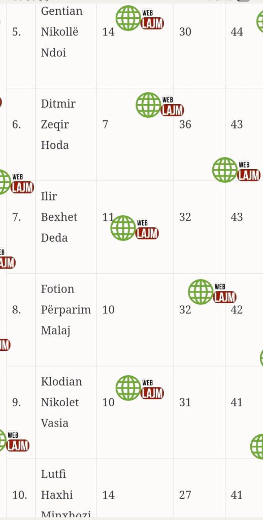 I pari i kësaj liste ka marrë 56 pikë dhe ai është Enea Sharra , ndërsa i fundit 41 pikë dhe është Lutfi Minxhozi.. z.Ndoji rezulton me 44 pikë.