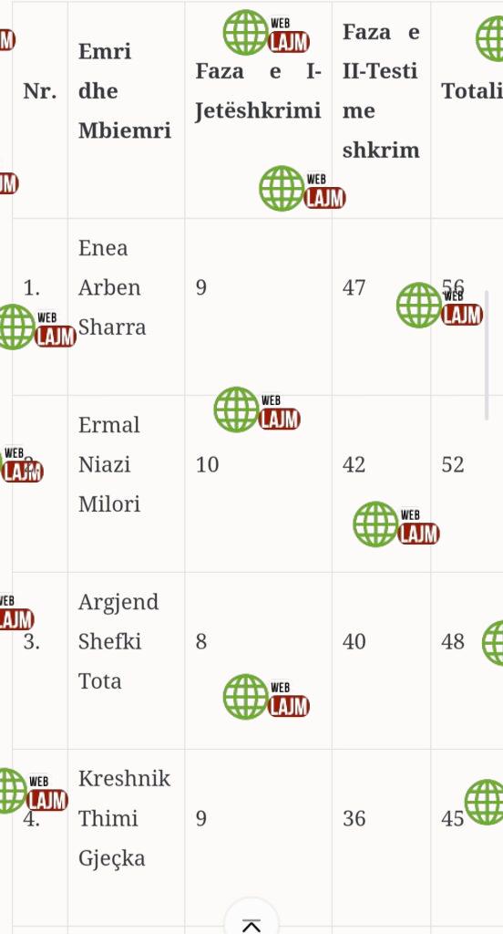 I pari i kësaj liste ka marrë 56 pikë dhe ai është Enea Sharra , ndërsa i fundit 41 pikë dhe është Lutfi Minxhozi.. z.Ndoji rezulton me 44 pikë.