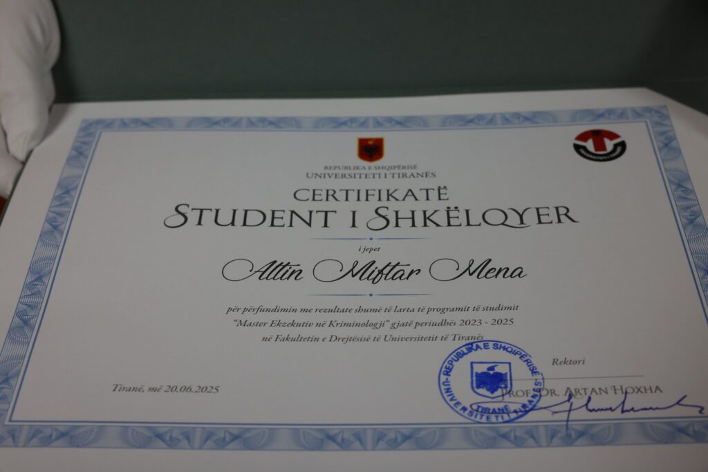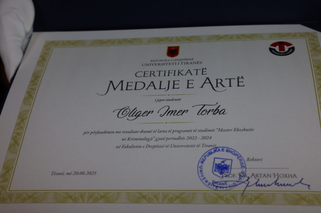 Universiteti i Tiranës akordon Medalje Ari/Argjendi në “Master Ekzekutiv në Kriminalogji”, për 2 punonjësit e Policisë, Drejtues Altin Mena dhe Kryekomisar Oliger Torba.