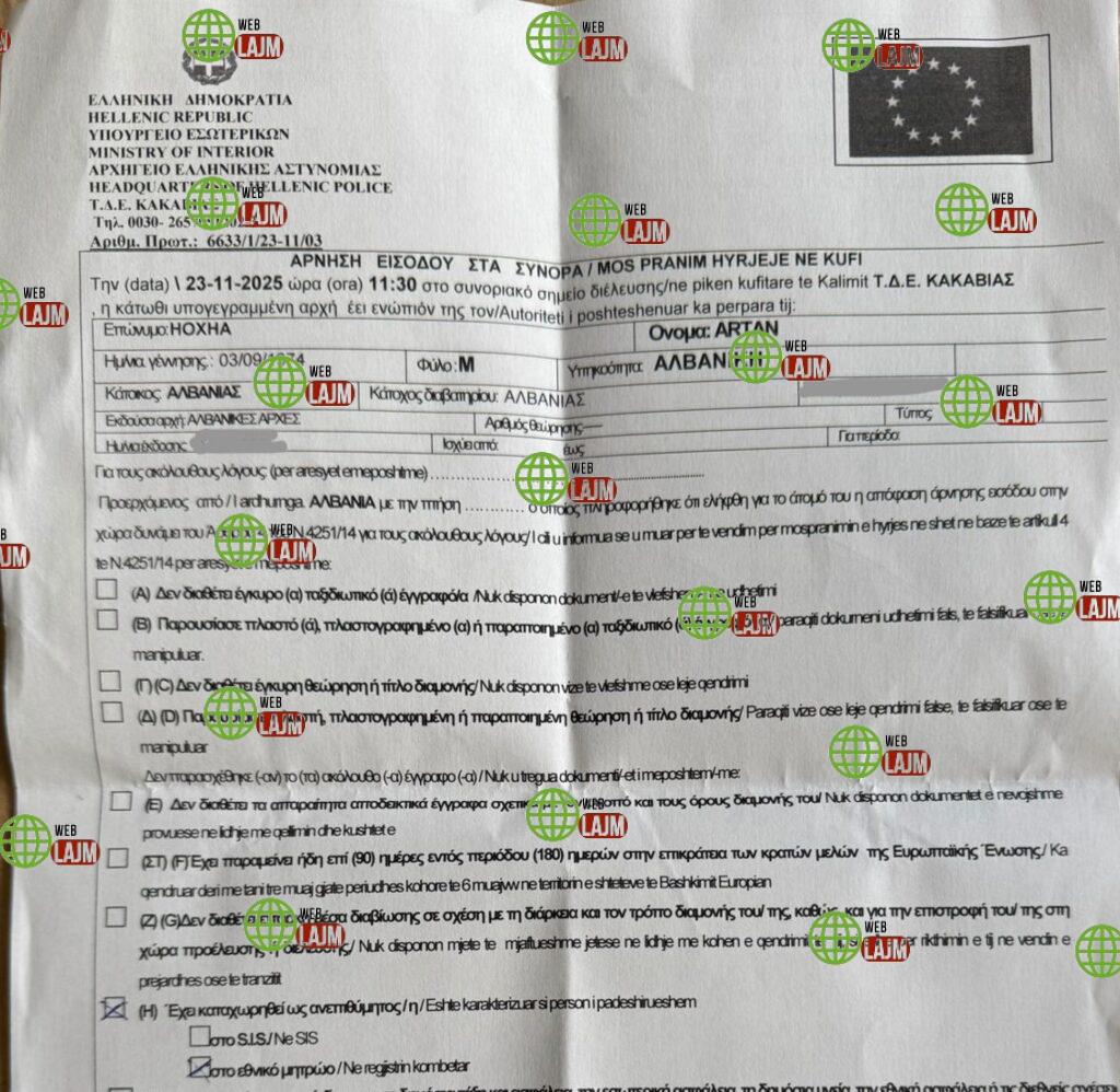 Më pas, gazetarit Hoxha i është vendosur kryq me stilolaps në pasaportë mbi vulën e policisë greke dhe i është kërkuar të largohet menjëherë nga territori grek.