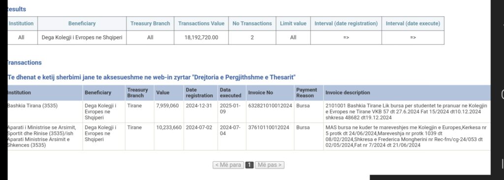 Në korrik dhe dhjetor të vitit 2024, nga taksat e shqiptarëve, përkatësisht Bashkia Tiranë dhe Ministria e Arsimit, kolegji ka marrë dy pagesa me vlerë afro 200 mijë euro.