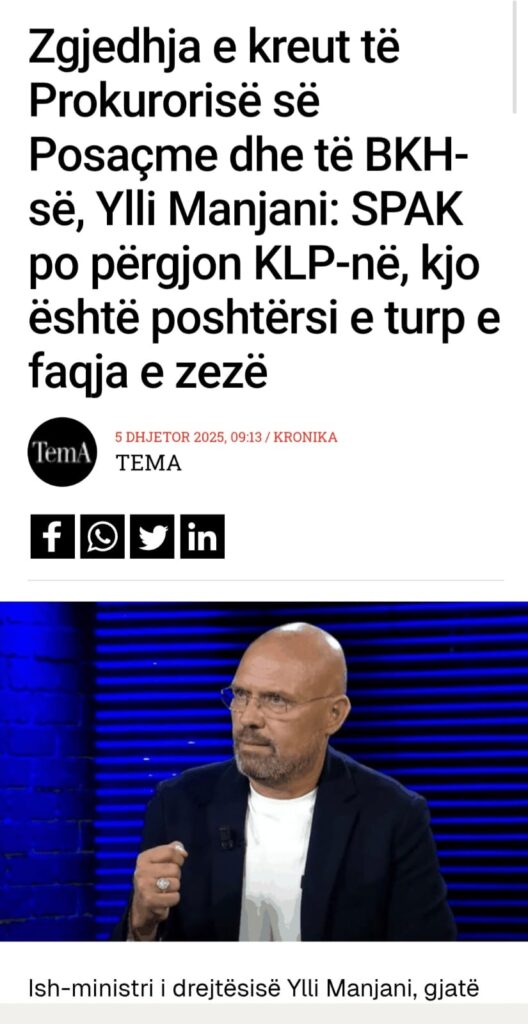 Pas akuzave të ish-ministrit të Drejtësisë, avokatit z. Ylli Manjani, se SPAK po përgjjon në shkelje të ligjit anëtarët e Këshillit të Lartë të Prokurorisë, ka ardhur edhe reagimi i SPAK. Në përgjigje të interesit të mediave për një koment mbi këto akuza, SPAK thotë se nuk ka asnjë hetim ndaj KLP-së apo ndonjë anëtari të saj, dhe po ashtu as përgjim apo vëzhgim ndaj tyre.