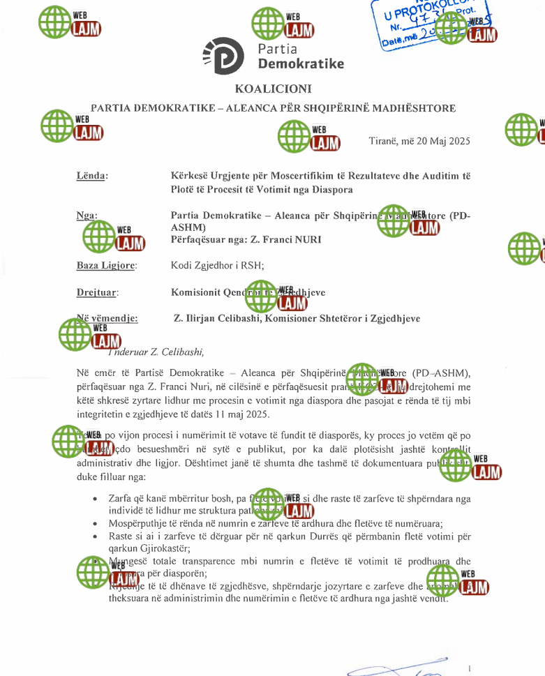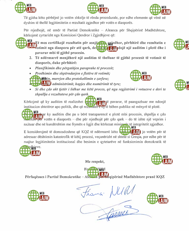 Selia blu i ka dërguar një shkresë urgjente KQZ-së, ku i kërkon që të mos certifikojë rezultatin zgjedhor dhe të nisë një auditim për procesin e votimit të diasporës.
