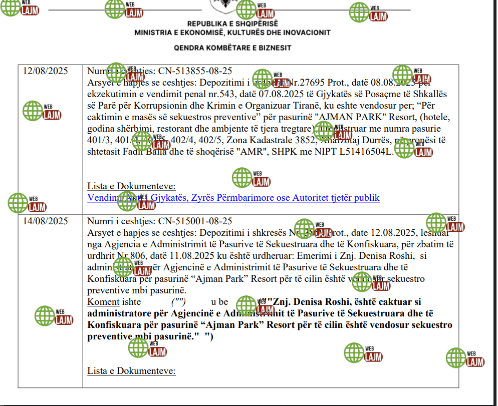 Me vendimin nr. 543 date 07.08.2025, Gjykata e Posaçme ka vendosur sekuestrimin preventiv për gjithsej 14 pasuri të llojeve të ndryshme me vlera disa miliona eurosh, duke përfshirë resorte, vila, apartamente, trualle, automjete dhe kuota në shoqëri, në emër të personave nën hetim si më poshtë: